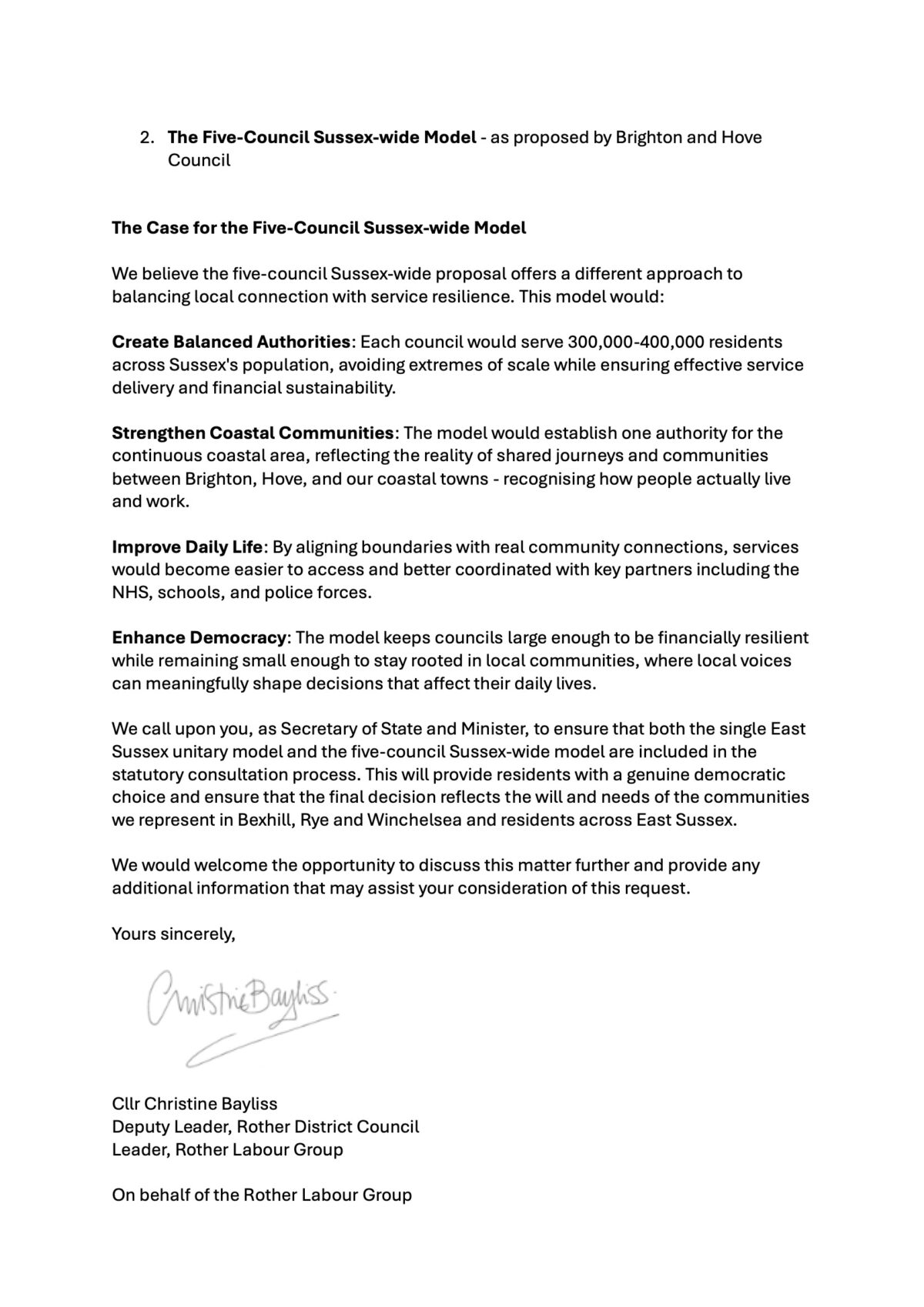 The Rother Labour Group has written to Ministers urging them to give Sussex residents a genuine choice between two restructuring options: a single East Sussex unitary authority or a five-council Sussex-wide model.